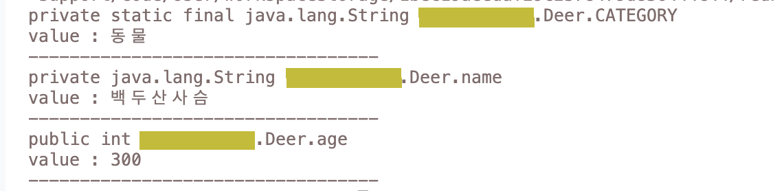 System.out.println("value : " + field.get(deer)); // 원하는 인스턴스의 정보
