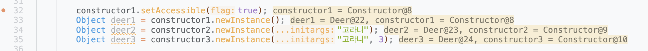 Object deer2 = constructor2.newInstance("고라니");